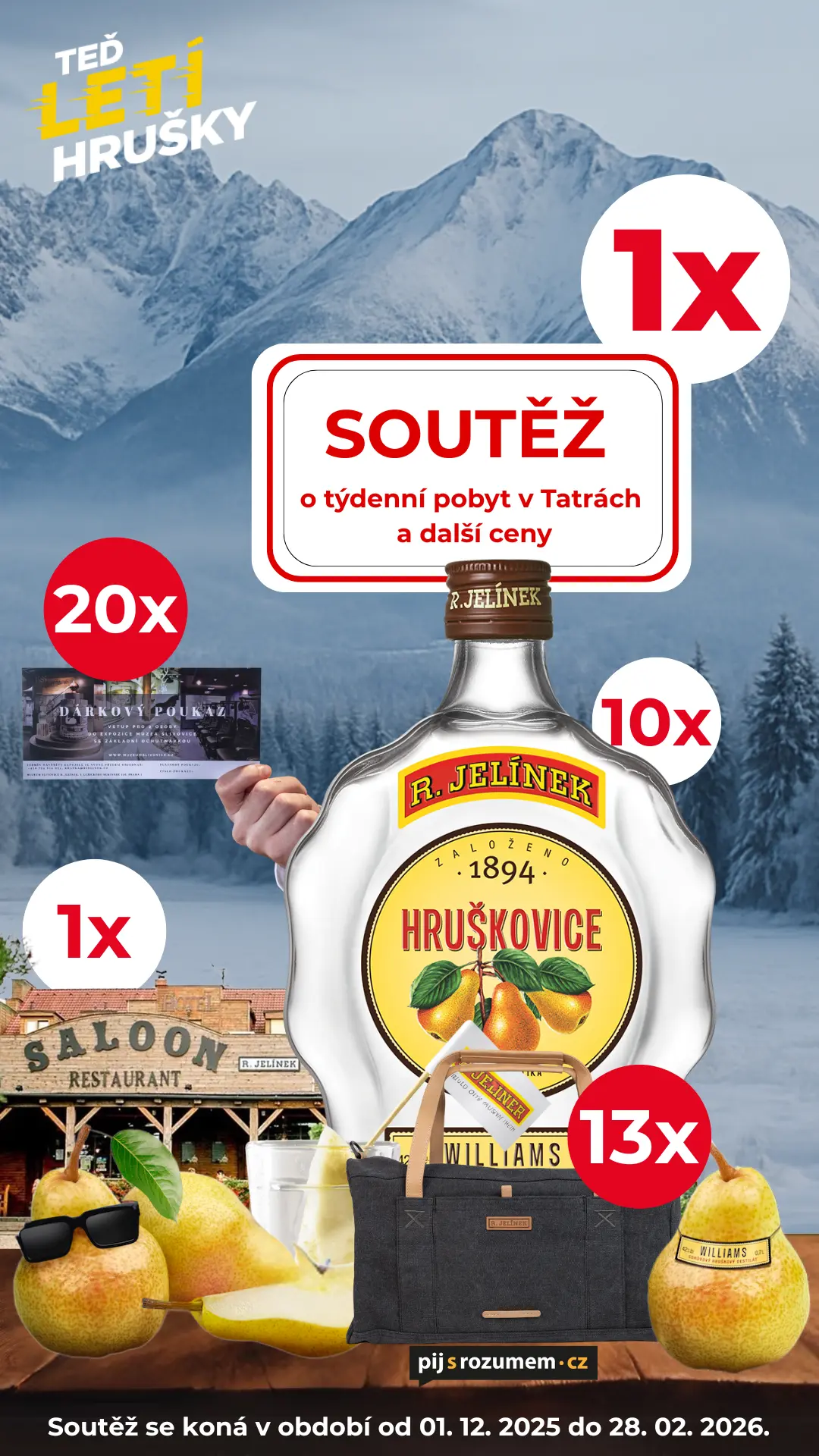 Nakupte v obchodě láhev R. JELÍNEK Hruškovice Williams 0,7l nebo 0,5l a nebo si v baru / restauraci objednejte 3 panáky R. JELÍNEK Hruškovice Williams